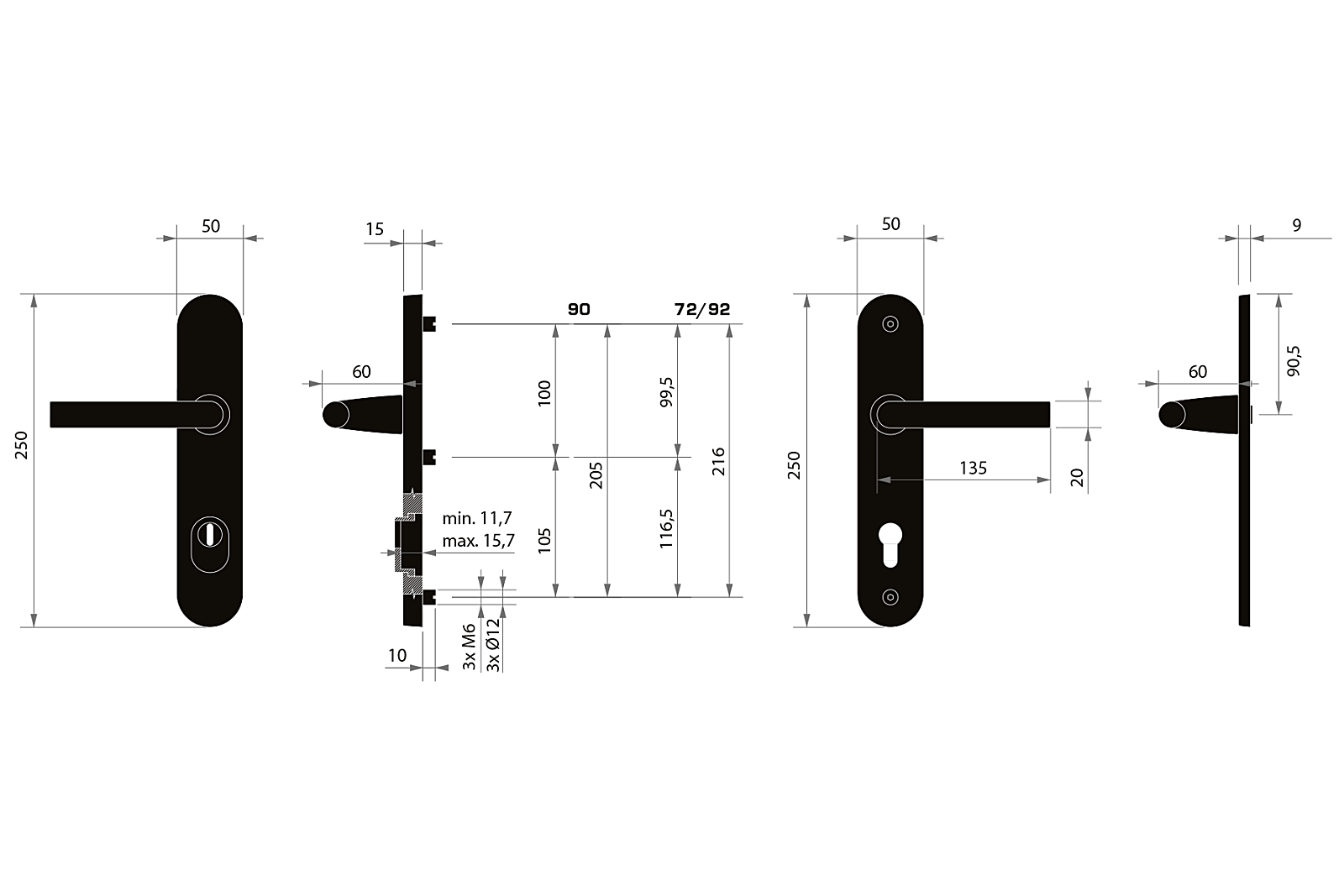 Kovanie sa upevňuje tromi bezpečnostnými skrutkami , pričom stredová skrutka je skrytá pod krytom. Model je dodávaný v rozstupoch 72 mm, 90 mm a 92 mm , takže sa ľahko prispôsobí rôznym typom dverí.