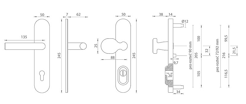 Pri bezpečnostnom kovaní je potrebné poznať vzdialenosť medzi osou kľučky a osou kľúča (rozteč). Štandardná vzdialenosť je 72, 90 alebo 92 mm. Kovanie je štandardom pre hrúbku dverí od 40 do 60 mm. V prípade, že máte inú hrúbku dverí, uveďte údaj do poznámky v objednávke.