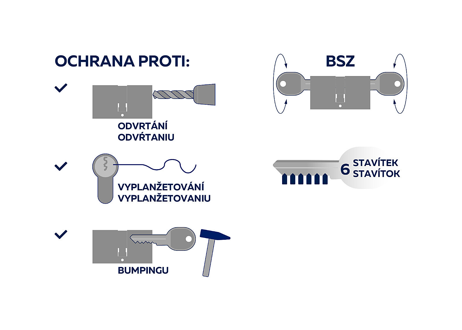 - Ochrana proti odvŕtaniu pomocou 6prvkov z kalenej ocele. Tvorí ju 5 kolíka a 1 stavítko