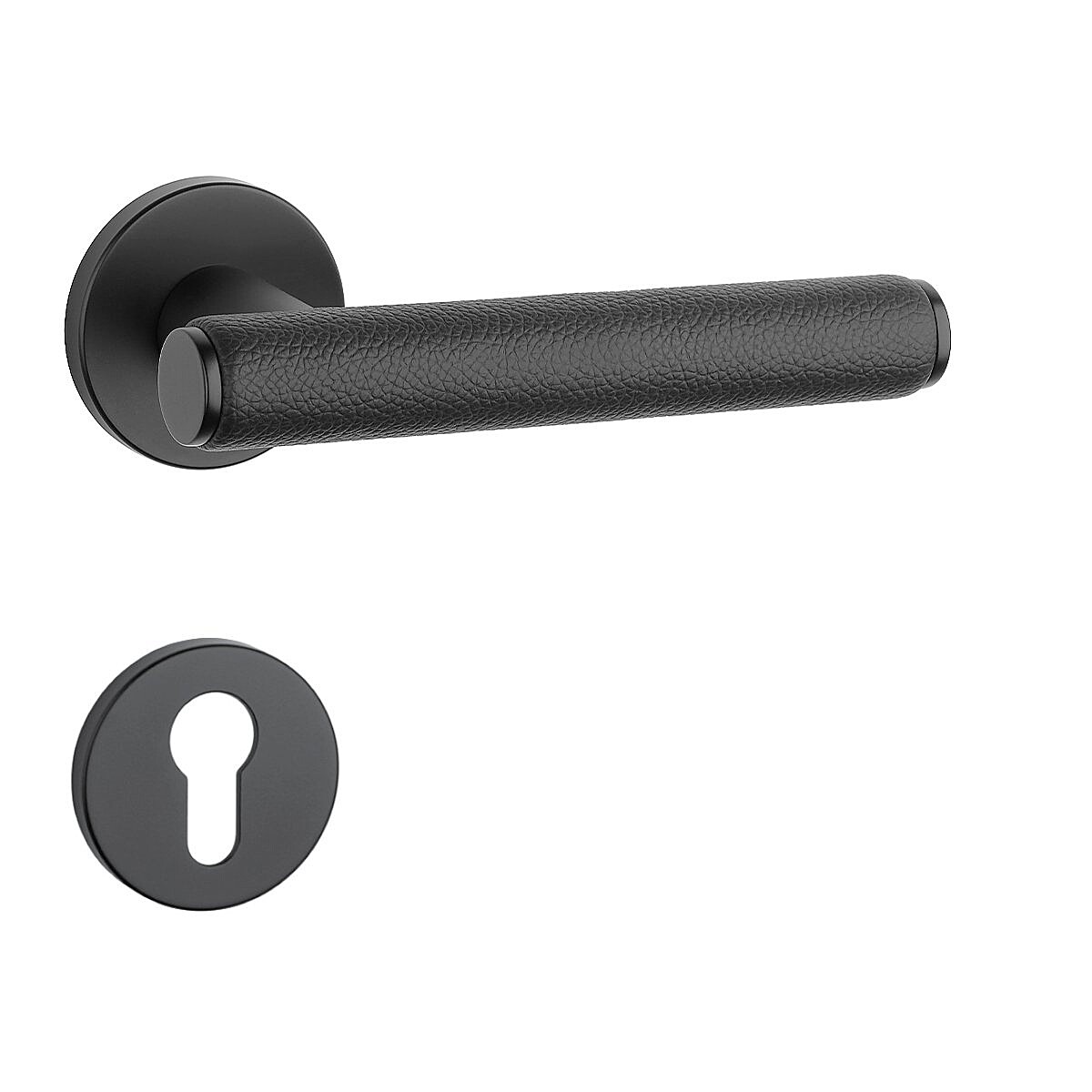 Rozetová kľučka na interiérové dvere s guľatou rozetou je vyrobená z materiálov vysokej kvality - zamak a je povrchovo upravená. Zaujímavým prvkom je čierna koža, ktorá obopína rukoväť kľučky.