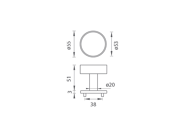 Guľa má priemer 53 mm a guľatá rozeta má priemer 55 mm a hrúbku len 3 mm.