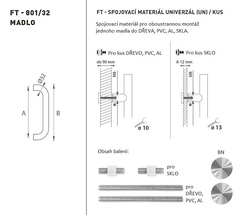 Madlo na dvere je vyrobené z vysoko kvalitnej nehrdzavejúcej ocele, známe ako nerez a je povrchovo upravené. Profil madla je Ø 32 mm. Súprava UNIVERZÁL (UN) obsahuje spojovací materiál pre obojstrannú montáž jedného madla do dreva, PVC, AL, skla.
