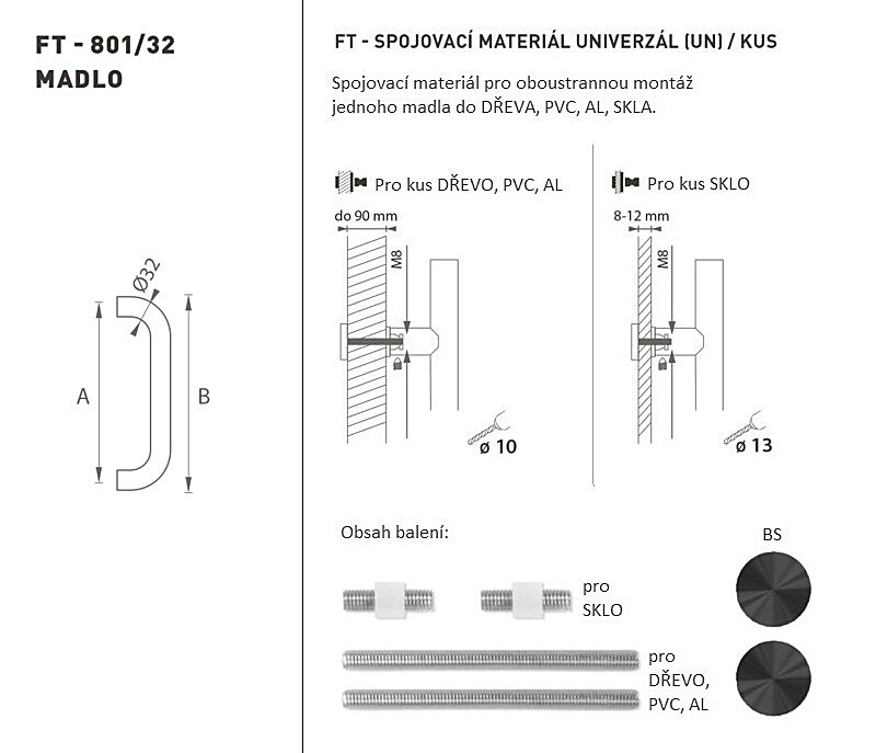 Madlo na dvere je vyrobené z vysoko kvalitnej nehrdzavejúcej ocele, známe ako nerez a je povrchovo upravené. Profil madla je 32 mm. Súprava UNIVERZÁL (UN) obsahuje spojovací materiál pre obojstrannú montáž jedného madla do dreva, PVC, AL, skla.