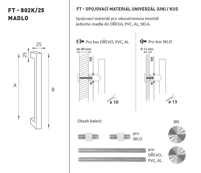 Madlo na dvere je vyrobené z vysoko kvalitnej nehrdzavejúcej ocele, známe ako nerez a je povrchovo upravené. Profil madla je 25 x 25 mm. Súprava UNIVERZÁL (UN) obsahuje spojovací materiál pre obojstrannú montáž jedného madla do dreva, PVC, AL, skla.