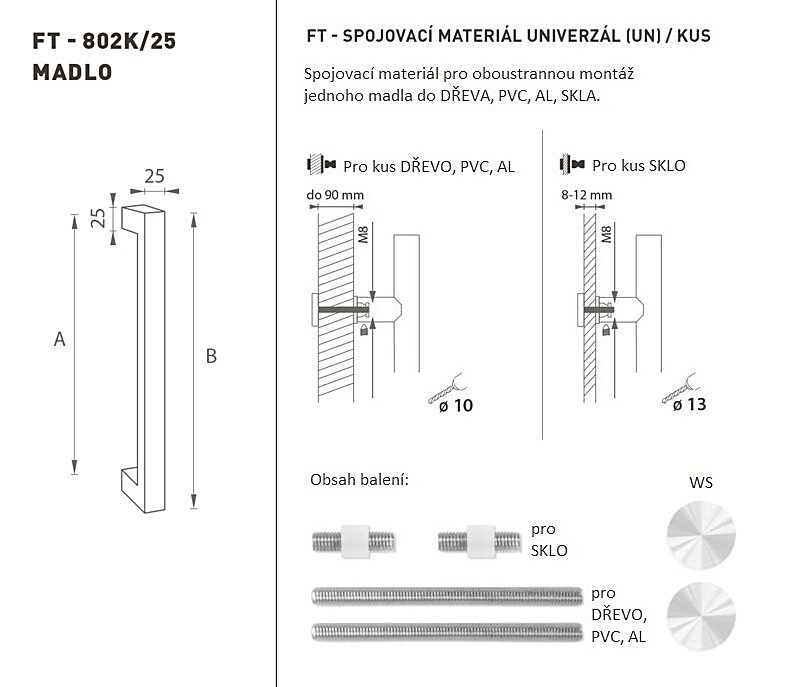 Madlo na dvere je vyrobené z vysoko kvalitnej nehrdzavejúcej ocele, známe ako nerez a je povrchovo upravené. Profil madla je 25 x 25 mm. Súprava UNIVERZÁL (UN) obsahuje spojovací materiál pre obojstrannú montáž jedného madla do dreva, PVC, AL, skla.