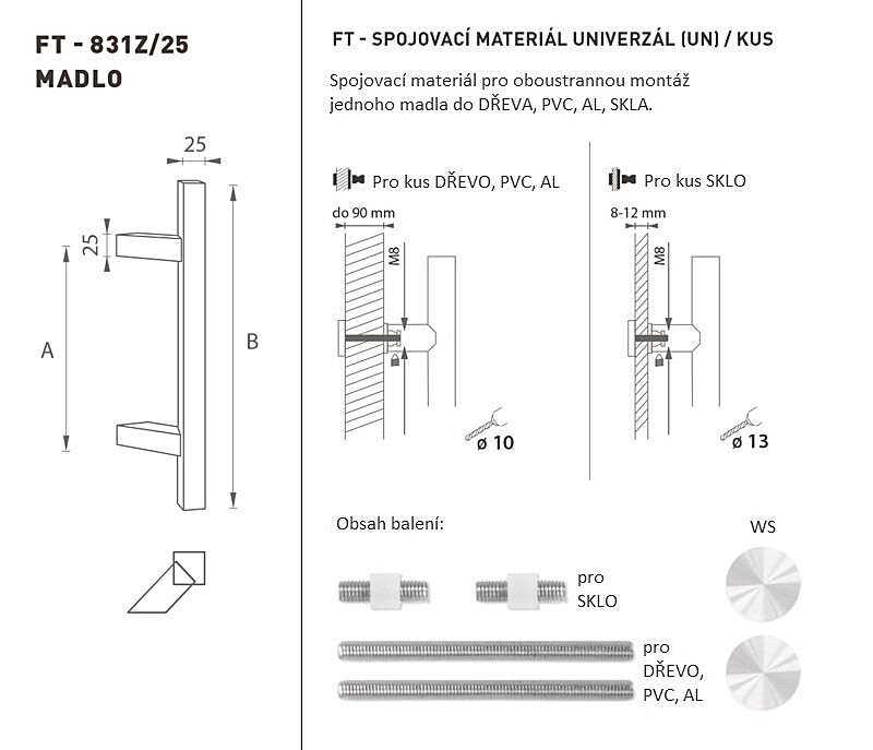 Madlo na dvere je vyrobené z vysoko kvalitnej nehrdzavejúcej ocele, známe ako nerez a je povrchovo upravené. Profil madla je 25 x 25 mm. Súprava UNIVERZÁL (UN) obsahuje spojovací materiál pre obojstrannú montáž jedného madla do dreva, PVC, AL, skla.