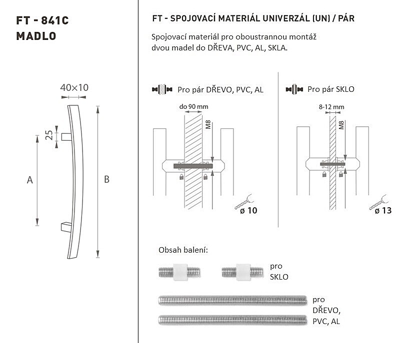 Madlo na dvere je vyrobené z vysoko kvalitnej nehrdzavejúcej ocele, známe ako nerez a je povrchovo upravené. Profil madla je 40 x 10 mm. Súprava UNIVERZÁL (UN) obsahuje spojovací materiál pre obojstrannú montáž dvoch madiel do dreva, PVC, AL, skla.