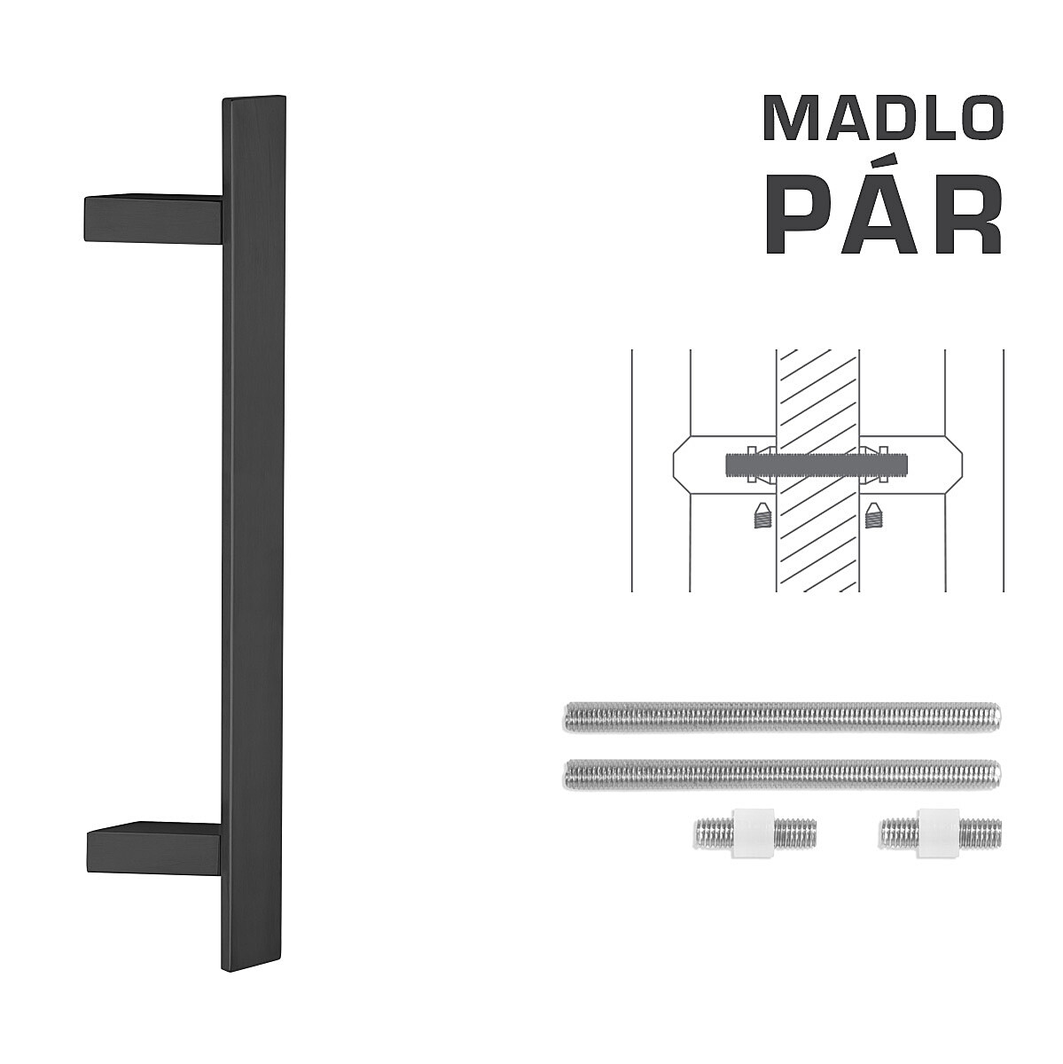 Madlo na dvere je vyrobené z vysoko kvalitnej nehrdzavejúcej ocele, známe ako nerez a je povrchovo upravené. Profil madla je 40 x 10 mm. Súprava UNIVERZÁL (UN) obsahuje spojovací materiál pre obojstrannú montáž jedného madla do dreva, PVC, AL, skla. Madlo s dĺžkou 1800 mm má 3 úchyty.