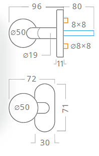 Nerezové kovanie s kvalitnou povrchovou úpravou vhodné pre stredne záťažové priestory, napríklad kancelárie, reprezentatívne miestnosti, priestory s bežným pohybom verejnosti, byty, domácnosti. Materiál: Nerez AISI 304 Vnútorná konštrukcia pod rozetou je plastová. Cena zahŕňa kovanie vrátane roziet a montážneho materiálu. Bez vratnej pružiny. Bez tŕňov proti pootočeniu. Pripevnenie skrutky zhora na krídlo dverí. Rozteč rozety: 50 mm