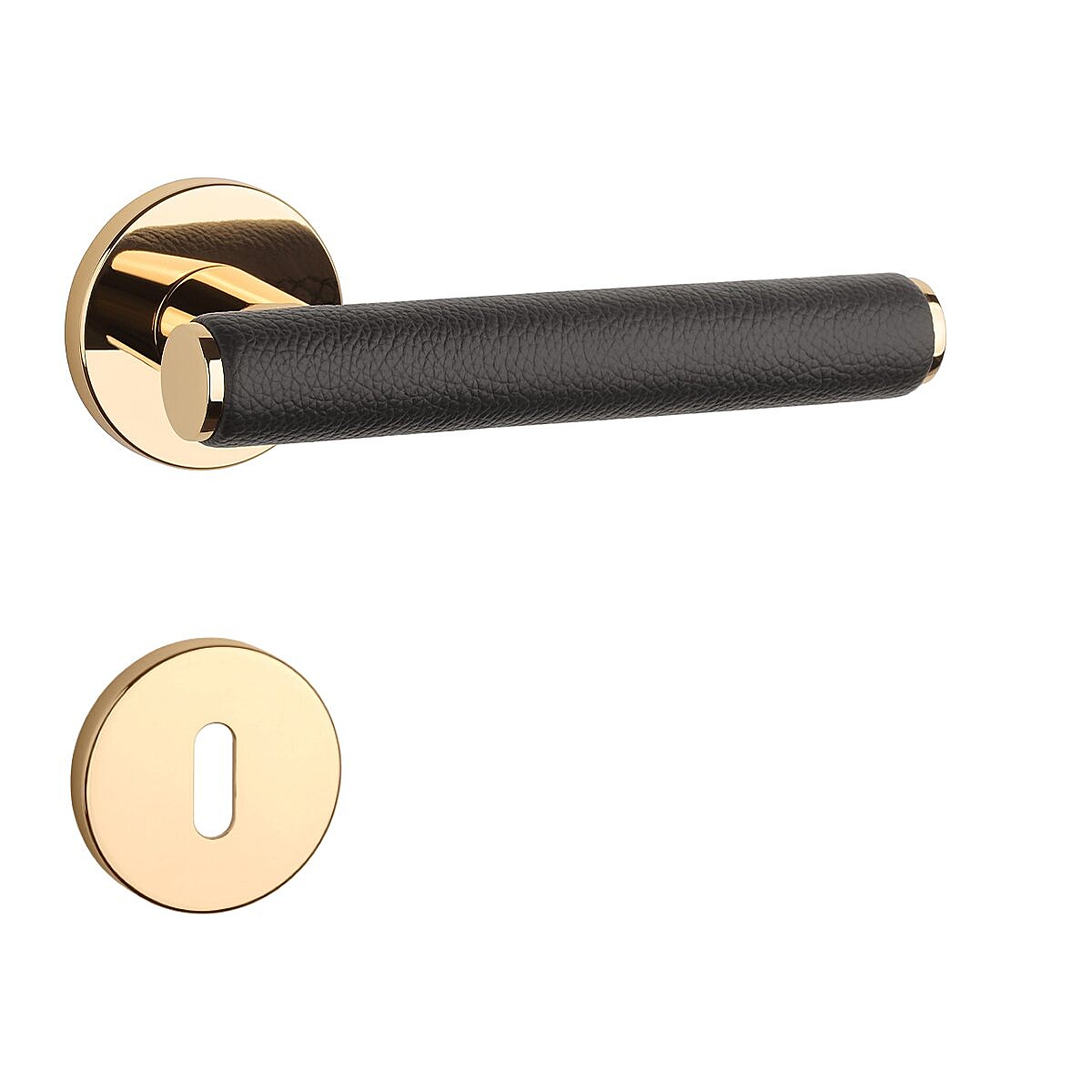 Rozetová kľučka na interiérové dvere s guľatou rozetou je vyrobená z materiálov vysokej kvality - zamak a je povrchovo upravená. Zaujímavým prvkom je hnedá koža, ktorá obopína rukoväť kľučky.