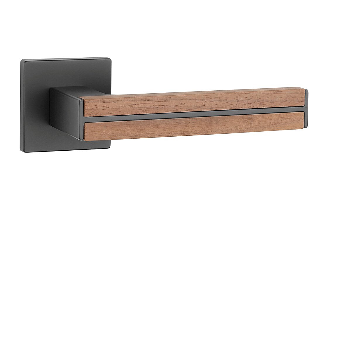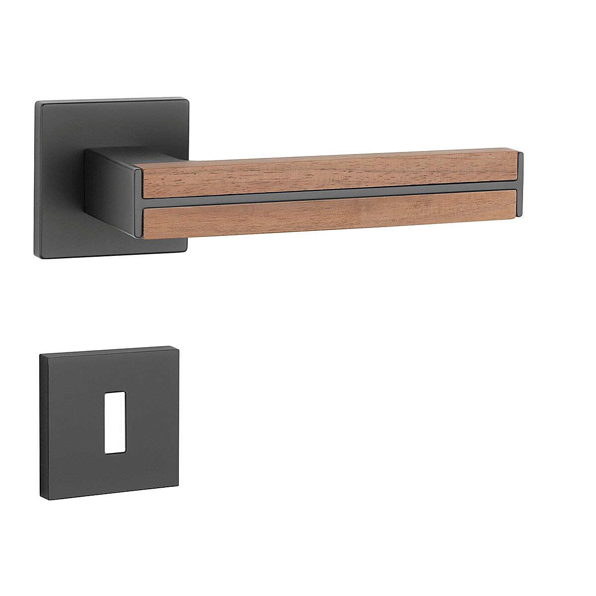 Rozetová kľučka na interiérové dvere s hranatou oblou rozetou je vyrobená z materiálov vysokej kvality - zamak a je povrchovo upravená. Kľučka pôsobí štýlovo a moderne, čo podčiarkuje aj kombinácia čiernej farby s orechovým drevom. Tento dekoračný prvok jej dodáva unikátny vzhľad a navodzuje príjemný pocit tepla a prírody.