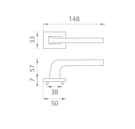 Rozetová kľučka na interiérové dvere s obdĺžnikovou rozetou je vyrobená z materiálov vysokej kvality - zamak a je povrchovo upravená. Rozeta má rozmer 50 x 33 mm a hrúbku iba 7 mm. Minimalistický dizajn rozety s vysokou stabilitou kľučky na dverách pôsobí jemne, a tým ponecháva priestor na vyniknutie dizajnu samotnej kľučky.