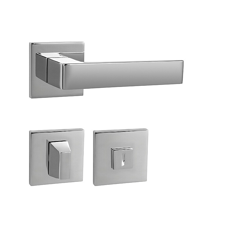 Rozetová kľučka na interiérové dvere s hranatou rozetou je vyrobená z materiálov vysokej kvality - zamak a je povrchovo upravená. Rozeta má rozmery 53 mm x 53 mm a hrúbku 6 mm.