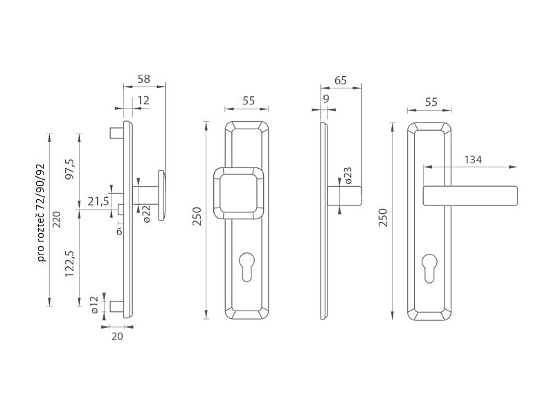 Štítová kľučka na vchodové a bezpečnostné dvere so spevneným hranatým štítom bez prekrytia cylindrickej vložky je vyrobená z materiálov vysokej kvality - mosadz a je povrchovo upravená. Hranatý štít má rozmery 55 mm x 250 mm a hrúbku 12 mm.