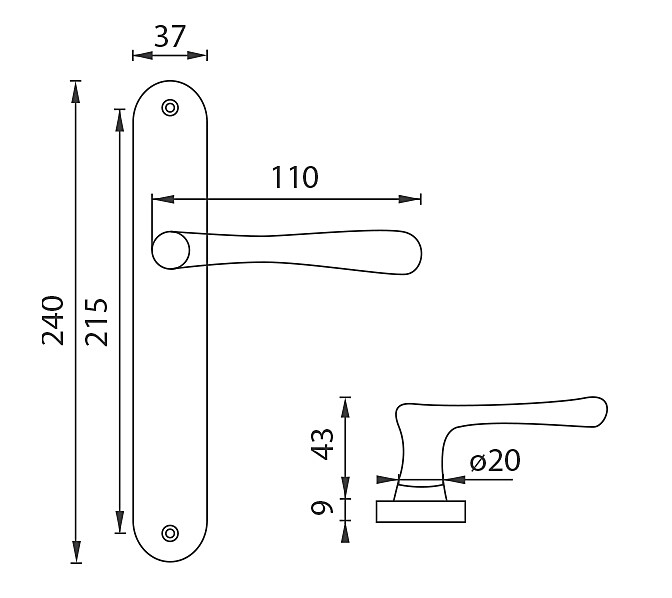 Štítová kľučka na interiérové dvere s oválnym štítom je vyrobená z materiálov vysokej kvality - mosadz a je povrchovo upravená. Oválny štít má rozmery 37 mm x 240 mm a kľučka obsahuje vratný mechanizmus.