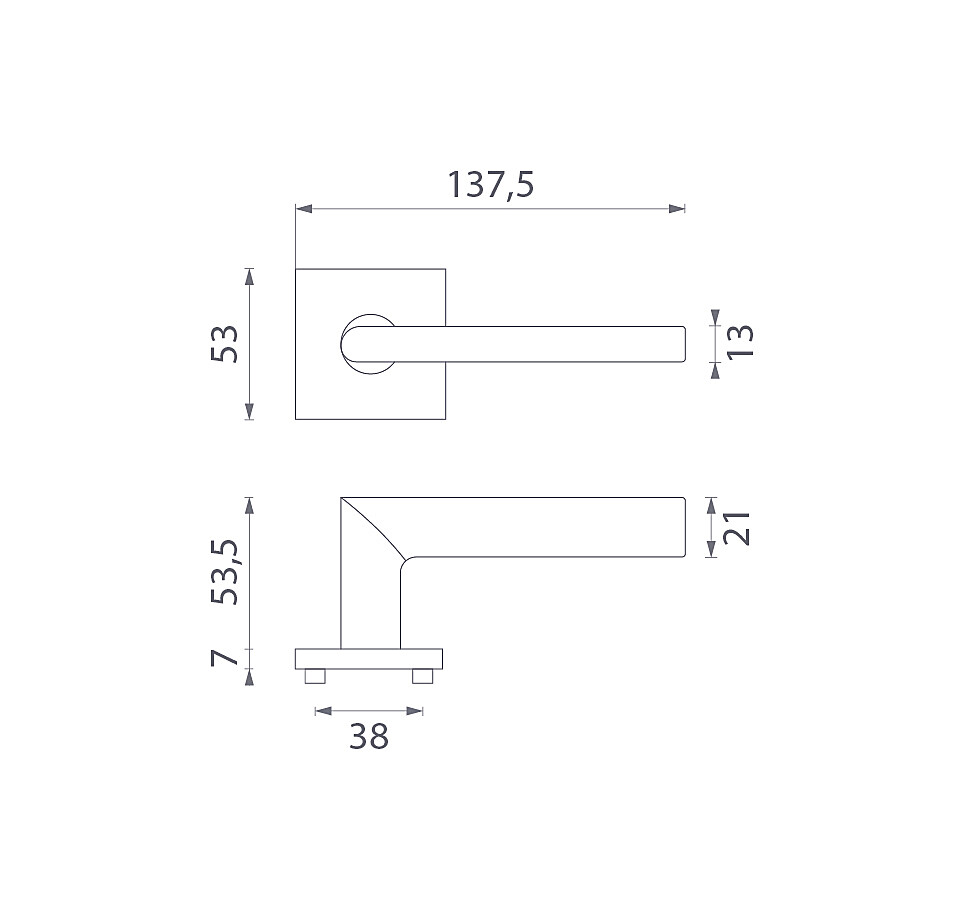 Rozetová kľučka na interiérové dvere s hranatou rozetou je vyrobená z materiálov vysokej kvality - zamak a je povrchovo upravená. Rozeta má rozmer 53x53 mm a hrúbku len 7 mm. Minimalistický dizajn rozety s vysokou stabilitou kľučky na dverách pôsobí jemne, a tým ponecháva priestor na vyniknutie dizajnu samotnej kľučky.