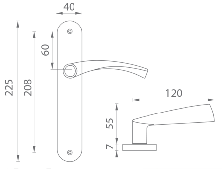 Štítová kľučka na interiérové dvere s oválnym štítom je vyrobená z hliníka a je povrchovo upravená. Oválny štít má rozmery 40 mm x 225 mm a kľučka neobsahuje vratný mechanizmus.