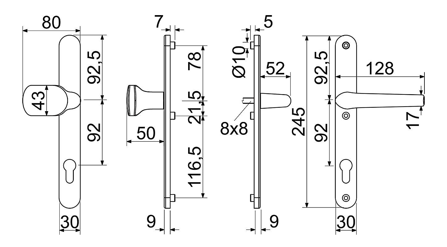 • RHD.005 - 72-92 mm - po skrátení štvorhranu a skrutiek od hrúbky dverí 40 mm