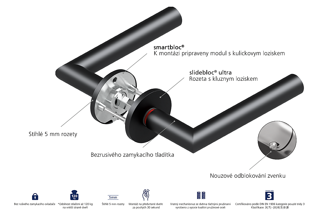 Vďaka inovatívnej funkcii zámku na západku ponúka systém smartbloc® bezpečné riešenie na zamykanie dverí bez toho, aby ste museli použiť tradičný zámok. Tento jedinečný systém umožňuje jednoduché a rýchle uzamknutie dverí stlačením kľučky, čo poskytuje dodatočné zabezpečenie. Táto užívateľsky prívetivá funkcia je praktická najmä v miestnostiach, kde je pravidelne vyžadované súkromie alebo bezpečnosť v krátkom čase.
