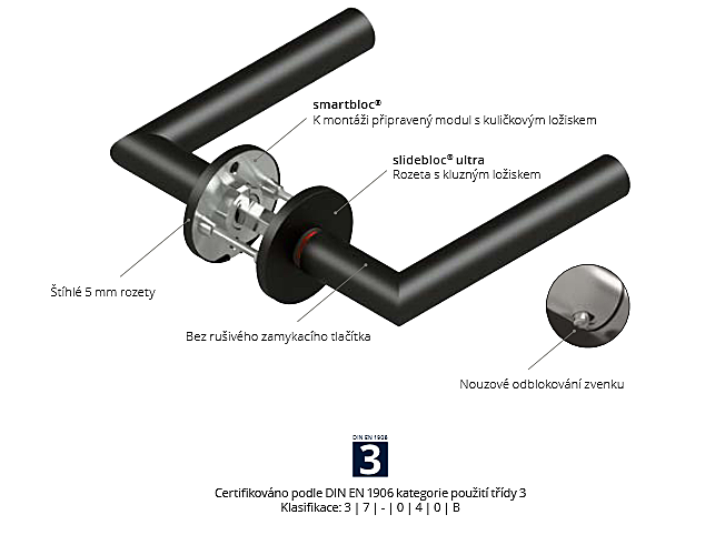 Vďaka inovatívnej funkcii zámku na západku ponúka systém smartbloc® bezpečné riešenie na zamykanie dverí bez toho, aby ste museli použiť tradičný zámok. Tento jedinečný systém umožňuje jednoduché a rýchle uzamknutie dverí stlačením kľučky, čo poskytuje dodatočné zabezpečenie. Táto užívateľsky prívetivá funkcia je praktická najmä v miestnostiach, kde je pravidelne vyžadované súkromie alebo bezpečnosť v krátkom čase.