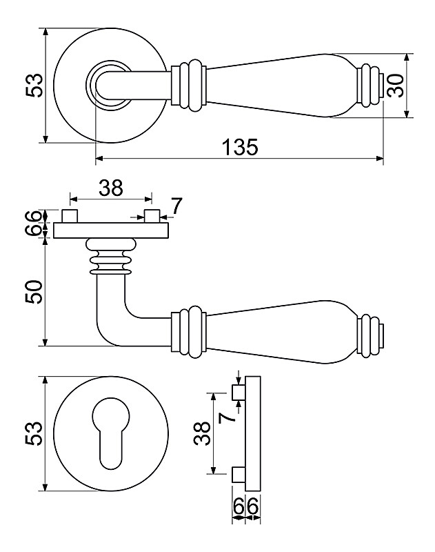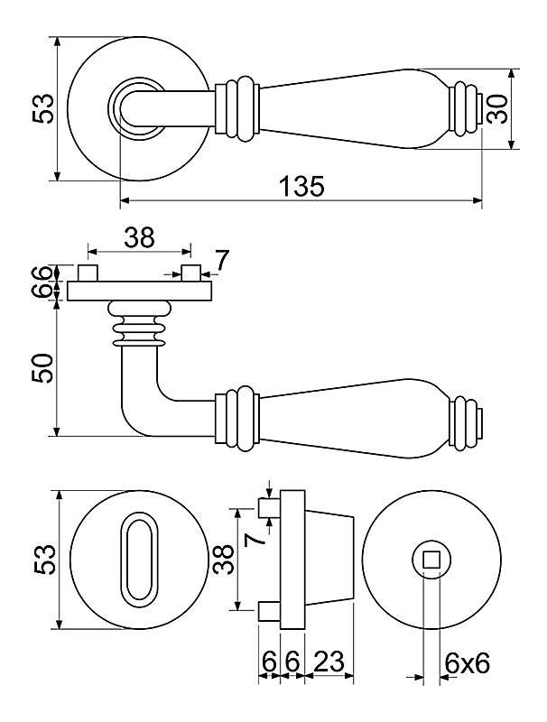 Zamakové kovanie na štvorcových, okrúhlych a obdĺžnikových rozetách s vratnou pružinou kľučiek