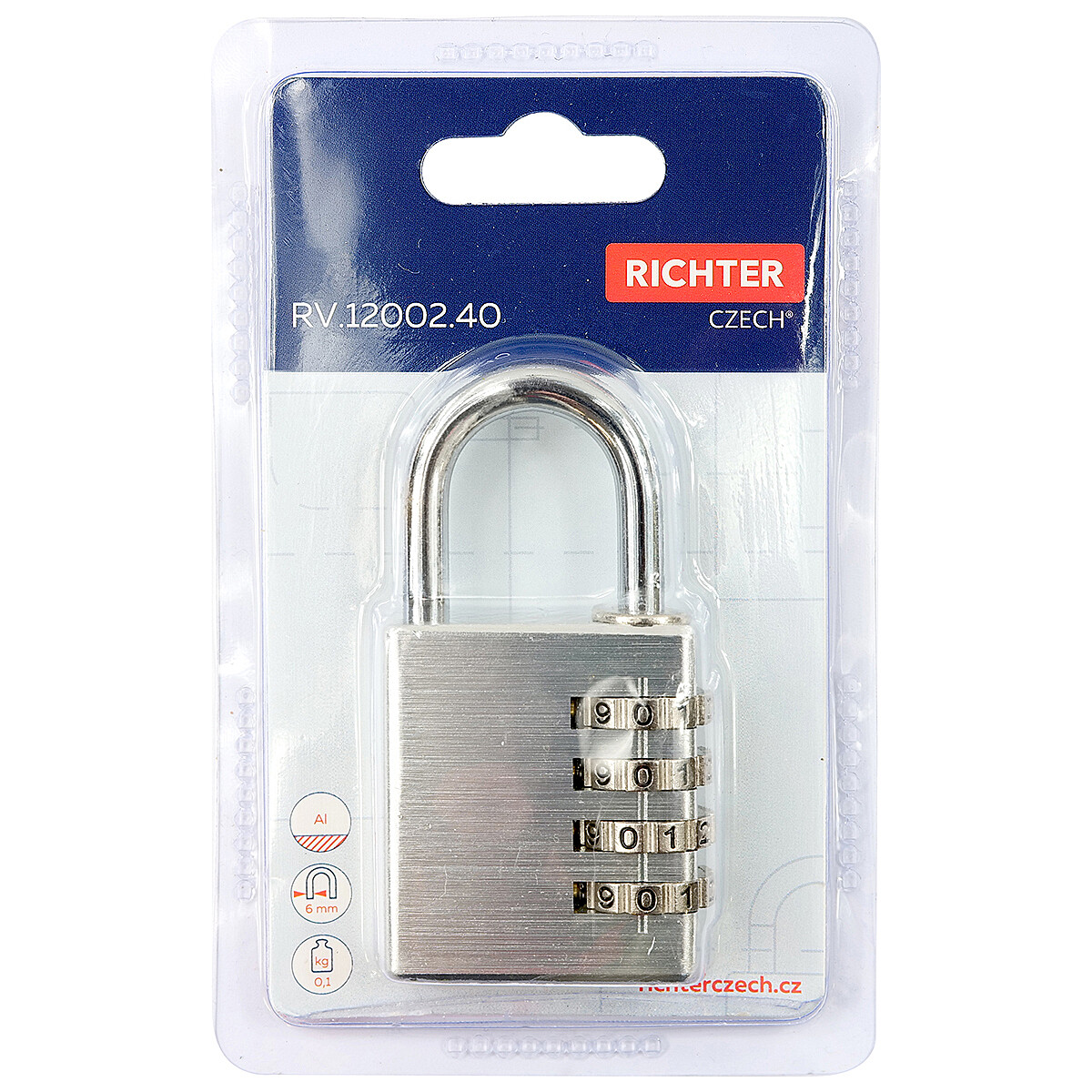 Hliníkový kódový visiaci zámok Richter RV.12002.40.STR