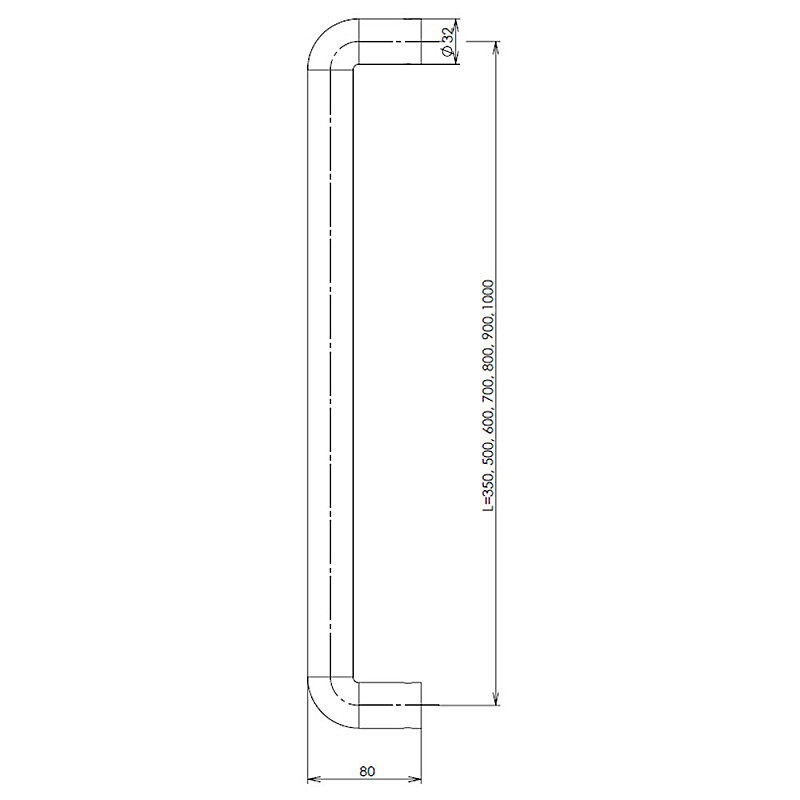 Toto dverné madlo je dostupné v celkovej dĺžke 382 (rozteč 350), 532 (rozteč 500), 632 (rozteč 600), 732 (rozteč 700), 832 (rozteč 800) alebo 1032 (rozteč 1000) alebo ako kus na jednostranné použitie. Pár nie je možné použiť ako dve jednostranné madlá.