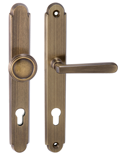 Štítová kľučka na vchodové a bezpečnostné dvere so spevneným rustikálnym štítom bez prekrytia cylindrickej vložky je vyrobená z materiálov vysokej kvality - mosadz a je povrchovo upravená. Rustikálny štít má rozmery 38 mm x 280 mm a hrúbku 11 mm.