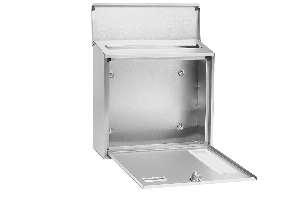 Nerezová schránka s okienkami z matného plexiskla umožňujúca čiastočný priehľad do jej vnútra