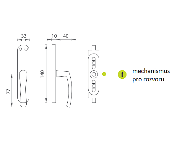 Rázvora na drevené okno s mechanizmom as oválnou rozetou je vyrobená z hliníka a je povrchovo upravená. Rozeta má rozmery 33 mm x 140 mm a hrúbku 10 mm.