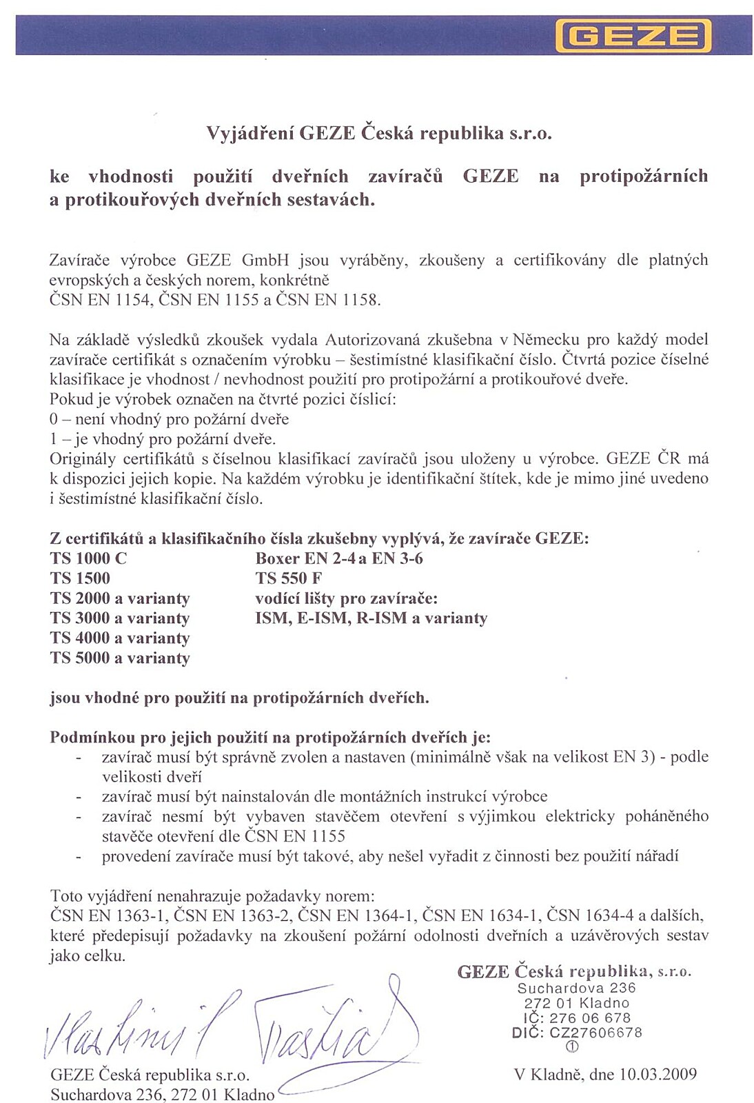 Horný dverný samozatvárač s klznou lištou GEZE - TS 3000 je vyrobený z hliníka a je povrchovo upravený. Samozatvárač spĺňa požiadavky normy STN EN 1154 a je testovaný na min. 500 000 zatváracích cyklov. Vyznačuje sa bezporuchovou prevádzkou a dlhodobou životnosťou.